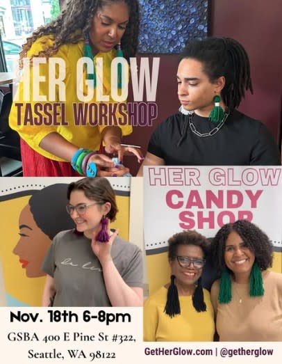 Join us for the HER GLOW TASSEL EARRING WORKSHOP! Just in time for the holiday gifting season, learn how to make your very own yarn tassel earrings that will light up any room! No jewelry making experience necessary - our expert instructor, HER GLOW CANDY SHOP owner Ife, will guide you every step of the way as you customize two (2) pairs of your own unique tassels In any size and color you choose!