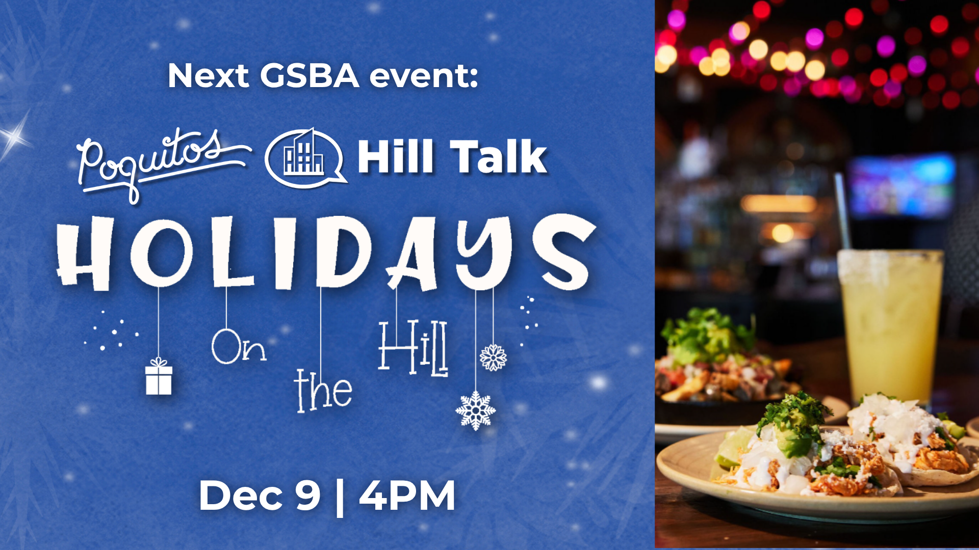 Join GSBA: Capitol Hill for our final Hill Talk of the year as we come together to celebrate the holidays with community. Connect with neighbors, small business owners, and local leaders in the festive warmth of Poquitos’ airy atrium. This gathering is open and welcoming to all—come as you are and help us toast another year of care, collaboration, and creativity on the Hill.