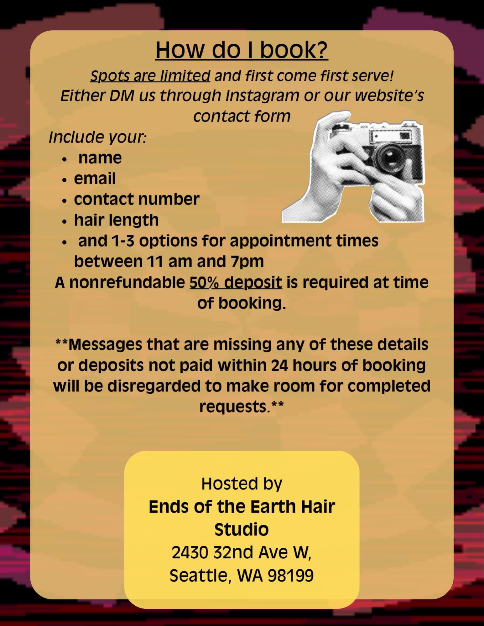 Email or private message our Instagram account directly with name, and contact info including email. Be sure to include your length of hair as it will affect the amount of time we’ll need. Once your appointment has been confirmed you’ll receive an email with a link to pay the deposit and finalize your booking. This deposit insures payment for the photographer’s time and makes sure we can get as many people in as possible.